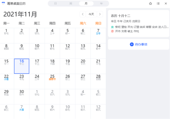 幂果桌面日历作为现代化办公场景中的得力助手,凭借其轻量化设计与高效功能组合,成为替代系统日历的优选工具。这款软件不仅支持基础日期查询功能,更深度整合天干地支测算与黄历宜忌指引,配合智能日程管理系统,帮助用户实现工作生活全方位规划。