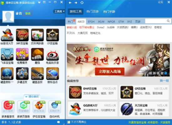简单百宝箱作为专业的网游辅助工具集,深度整合二十余项实用功能模块,全面覆盖主流游戏场景需求。其独创的智能适配技术可无缝兼容《地下城与勇士》《穿越火线》《英雄联盟》等二十余款热门网游,为玩家打造高效便捷的游戏体验环境。