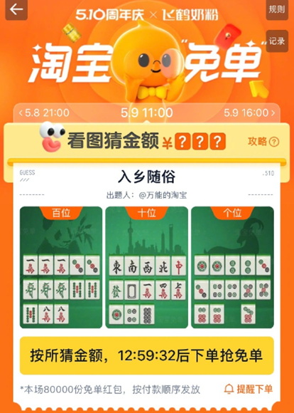 淘宝59免单活动答案解析众多用户关注淘宝5月9日免单活动的具体参与方式与正确答案,经实测验证当日11时的免单金额为93元,通过准确识别图片线索并在指定时间完成订单支付,即可享受全额返现优惠。