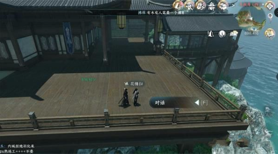 1.前往东极海坐标698.416区域,与持剑而立的NPC花慵扫展开对话。该角色身着青灰色劲装,对话过程中需注意选择带有武学探讨倾向的选项。