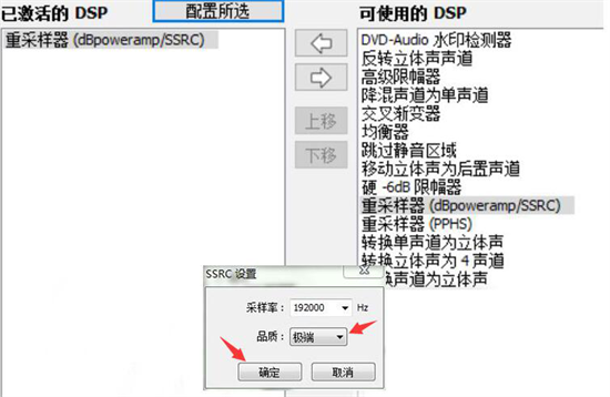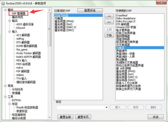 2、在左侧功能树中定位"播放-DSP管理器"模块,右侧可用插件列表包含多个音频处理模块。通过双击操作将"回旋混响器""均衡器""重采样器"三大核心组件移入激活队列,注意加载顺序影响音频处理链路。