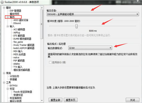 6、输出设备配置环节需注意:选择DirectSound主驱动时,建议缓冲长度设置为2000ms以上确保数据完整性。32位浮点格式能最大限度保留动态范围,ASIO驱动用户需单独配置缓冲区参数。
